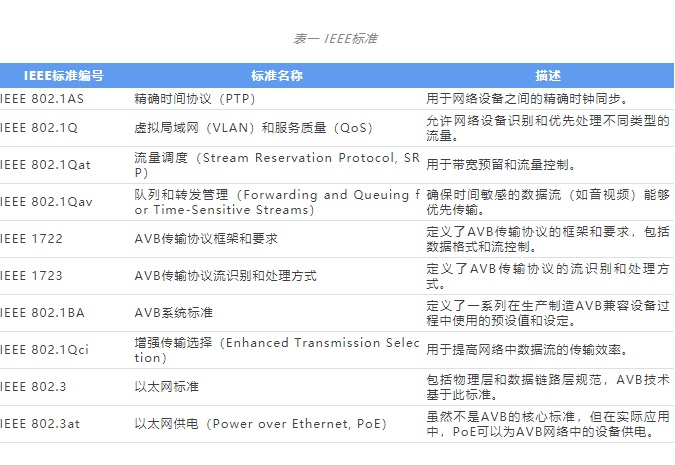 - 標(biāo)準(zhǔn)化優(yōu)勢:由 IEEE 標(biāo)準(zhǔn)化協(xié)議(表一),這意味著任何供應(yīng)商都可以遵循標(biāo)準(zhǔn)實現(xiàn) AVB 堆棧。不同供應(yīng)商的不同芯片組都有現(xiàn)成的 AVB 堆??晒┻x擇,這極大地促進了 AVB 技術(shù)在市場上的推廣和應(yīng)用,降低了技術(shù)門檻和開發(fā)成本。