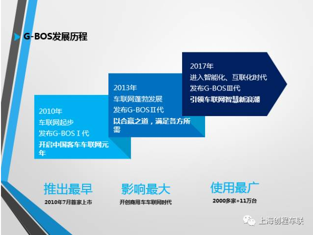 經(jīng)歷了公司成立之初的艱辛砥礪后,上海創(chuàng)程于2013年5月22日在北京上市發(fā)布G-BOS智慧運(yùn)營(yíng)系統(tǒng)II代,與其他類似產(chǎn)品一個(gè)顯著不同之處是實(shí)現(xiàn)了“三合規(guī)”:一是通過(guò)了公安部CCC檢測(cè)認(rèn)證、交通運(yùn)輸部部標(biāo)認(rèn)證;二是GPS/北斗雙模終端率先通過(guò)交通運(yùn)輸部部標(biāo)認(rèn)證,成為客車行業(yè)首家;三是率先通過(guò)交通運(yùn)輸部平臺(tái)符合性檢測(cè),這也是客車行業(yè)首家。G-BOS智慧運(yùn)營(yíng)系統(tǒng)II代獨(dú)創(chuàng)性地提出了“帶機(jī)入網(wǎng)”的業(yè)務(wù)模式,啟動(dòng)深藍(lán)計(jì)劃,與國(guó)內(nèi)各地的GPS運(yùn)營(yíng)商建立并展開廣泛合作,著力于解決G-BOS的落地接入問(wèn)題,為G-BOS的商業(yè)運(yùn)營(yíng)奠定了堅(jiān)實(shí)的基礎(chǔ)。