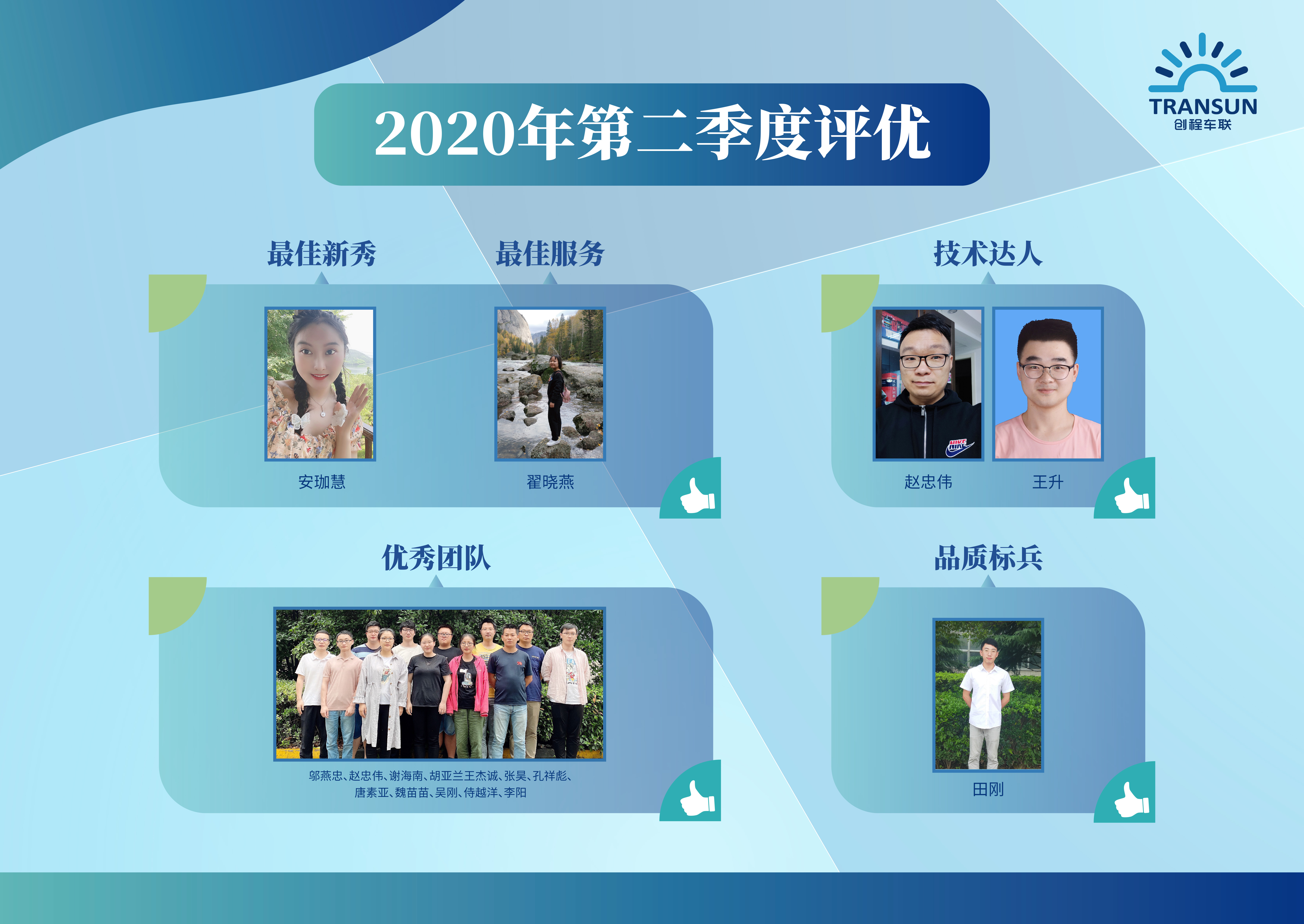 經(jīng)過層層篩選,第一季度優(yōu)秀員工評選活動已圓滿落下帷幕,他們分別是:優(yōu)秀團(tuán)隊(duì)車聯(lián)網(wǎng)研發(fā)團(tuán)隊(duì)、技術(shù)達(dá)人趙忠偉,王升、品質(zhì)標(biāo)兵田剛、最佳服務(wù)翟曉燕、最佳新秀安珈慧。他們用實(shí)際行動證明了在平凡的崗位上也能做出不平凡的貢獻(xiàn),是大家學(xué)習(xí)的榜樣和楷模。