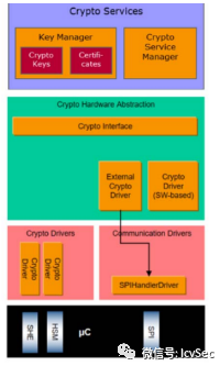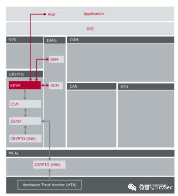 Crypto (HW)模塊作為訪問安全算法和函數(shù)的驅(qū)動程序,通過硬件信任錨(HTA)提供。有不同的HTA類型,如安全硬件擴(kuò)展(SHE)和硬件安全模塊(HSM)。