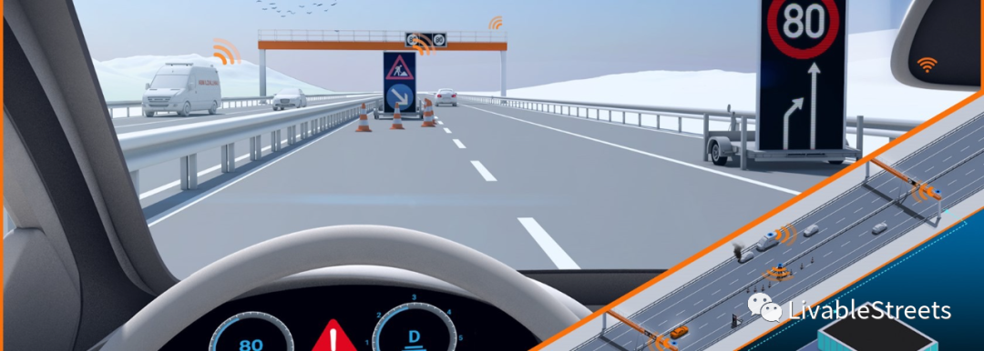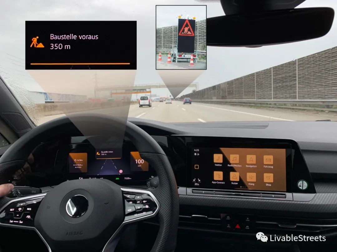 "施工現(xiàn)場(chǎng)預(yù)警“:在道路施工現(xiàn)場(chǎng)前幾百米,已經(jīng)通過(guò)C-ITS指示出了危險(xiǎn)區(qū)域。這提升了道路安全。