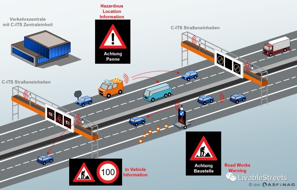 奧地利ASFiNAG的C-ITS戰(zhàn)略,圖中包括了:1. 集成C-ITS中央設(shè)備的交通控制中心,2. 移動(dòng)車(chē)輛發(fā)布的危險(xiǎn)地點(diǎn)信息:“注意,前方事件!”,3. 施工車(chē)輛發(fā)布的道路施工預(yù)警:“注意,前方施工!,4. 車(chē)內(nèi)收到的信息“施工,臨時(shí)限速100”,以及5. 龍門(mén)架上的C-ITS設(shè)備單元