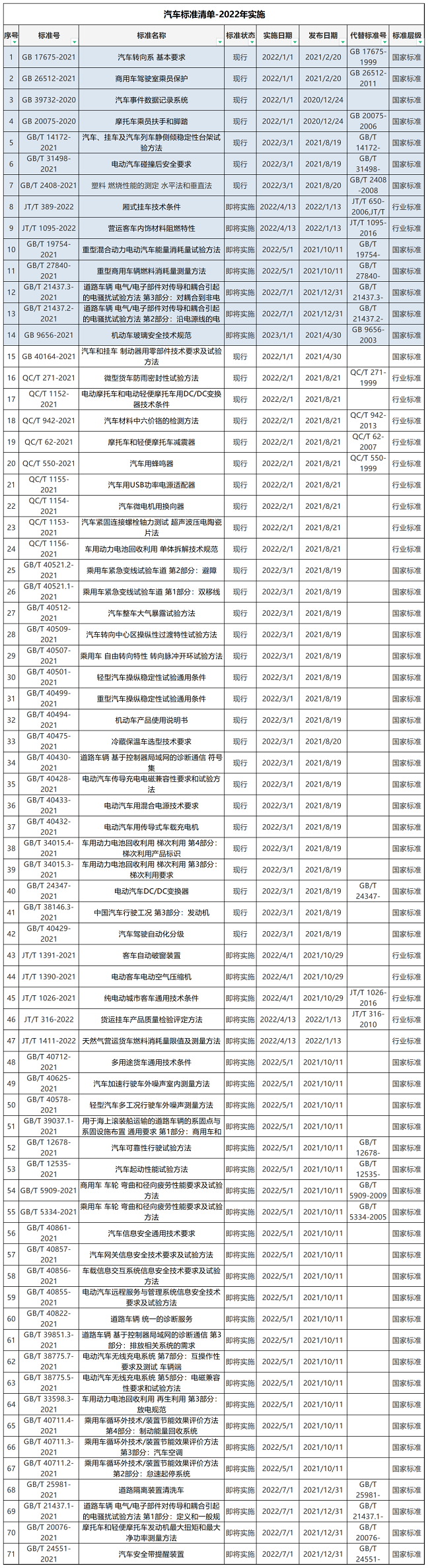 自2022年1月1日起,14項強(qiáng)檢汽車標(biāo)準(zhǔn)和57項非強(qiáng)檢汽車標(biāo)準(zhǔn)開始實施?,F(xiàn)對2022年1月1日起正式實施的汽車標(biāo)準(zhǔn)進(jìn)行了整理匯編,供大家參考。
