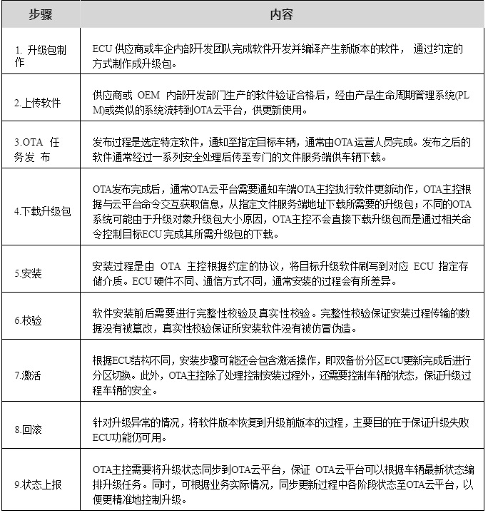 圖2-1 是一個(gè)典型的 OTA 系統(tǒng)框架,包含了三個(gè)基本要素,即云端的 OTA 平臺(tái)、車(chē)端 OTA 主控、OTA 對(duì)象。其中:OTA 云平臺(tái)負(fù)責(zé) OTA 升級(jí)包管理、車(chē)輛管理及 OTA 發(fā)布等功能,車(chē)端 OTA 主控負(fù)責(zé)從 OTA 云平臺(tái)下載升級(jí)包并將其刷寫(xiě)到目標(biāo) ECU ,OTA 升級(jí)對(duì)象即最終軟件刷寫(xiě)的主體,從主控接收軟件并完成自身軟件更新。OTA 的基本實(shí)現(xiàn)流程(圖2-1)可歸納為下表 2-3 所示步驟。